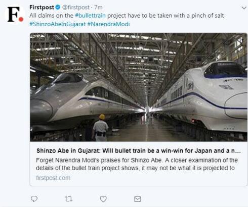 印度《第一邮报》则谨慎表示,必须对印度修建高铁所附带的那些条件和要求持有将信将疑的态度,安倍出访印度,虽然在日本看来像是获得了双赢,但是对印度而言有可能是全输。道理虽然都对,但是配图依旧是中国高铁。