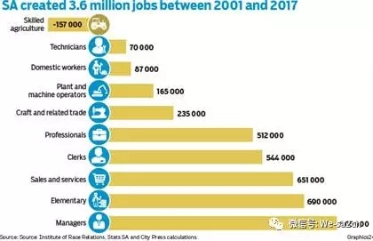 2001-2017年间,南非的雇用人口数量增长了360万,达到目前的1610万;但是增长速度最快的,仍然是专业人员领域。17年间,这一领域的就业增长达到133%。