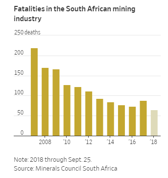 华尔街日报称,南非矿区的死亡人数在去年出现了十年来的首次上升,从一年前的73人增加了21%至88人。