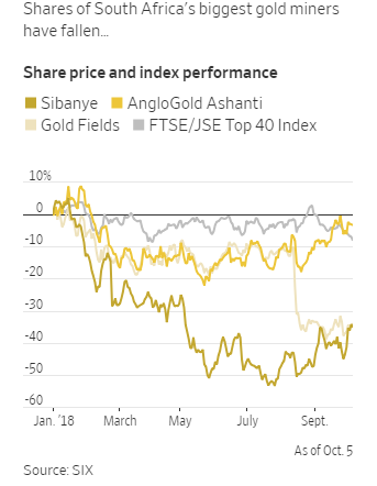 华尔街日报称,由于当前全球金价仍比2011年高位低约40%,南非三大黄金矿商的市值去年蒸发了约5.43亿美元。与全球平均水平相比,南非的黄金开采成本不断上升,人员伤亡也在增加。