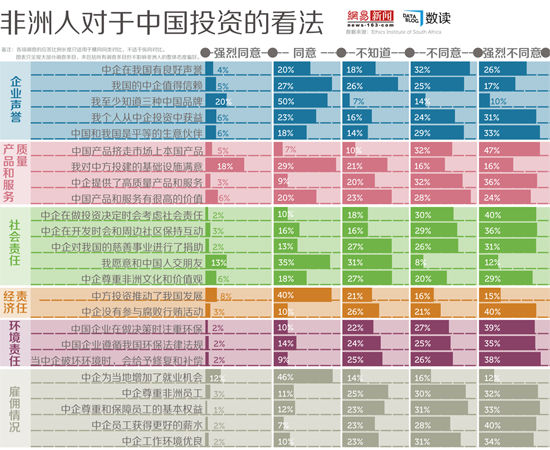 近日,南非职业道德研究所公布了一项针对在非中国企业的形象调查,参与调查者为来自15个非洲国家的常年与中国保持经济合作关系的经理人。报告分别就在非中企的声誉、产品和服务质量、社会和经济责任、对环保的重视以及雇佣状况进行了调查,结果显示,在非洲人眼中,当地的中国企业呈现全方位的明显负面形象:它们不仅声誉不好、产品服务质量差,还毫无社会责任感,工资不高,也不尊重非洲员工。