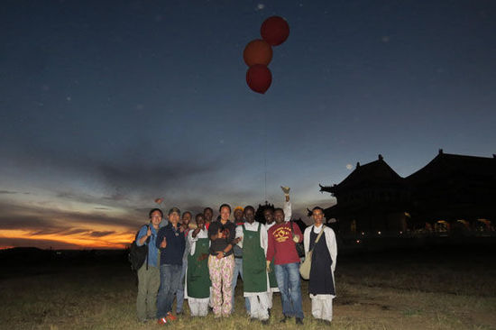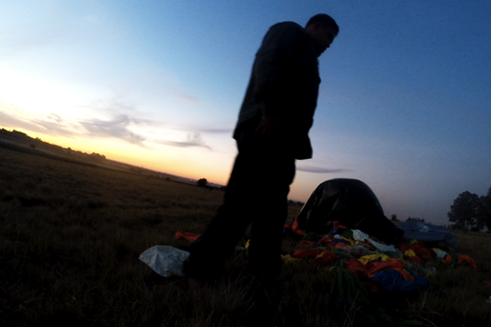 张昕宇还跟我们分享了当时发生的一件趣事:“树丛里钻出来一个黑影,远远地看着我,傍晚的能见度有限,我看不见他的脸,扬起手远远地跟他打招呼:‘Hello。’没有回应。‘Hi,Baba?’这是我电视里学的招儿,对黑人的称呼。依然没搭理我,就是远远地看着我。我有点儿心虚了,不会是来抢我的吧?拖着这么大一串气球,我也跑不了,索性不去想他了,开始拉绳子,戳气球。挺费力的,远处还有个人盯着我,特别不自在,我又喊了一句:‘Can you help me?’不料听到这句,他动了,拔腿就跑了过来,也不说话,帮着我往下拉绳子。当然我没敢把刀给他。有个人帮忙干起来轻松多了,很快气球就全部被戳破了。我忙不迭地向那位黑人兄弟道谢,他依然不语。我问他抽烟吗,他这才憨厚一笑,点了点头。我一摸口袋,尴尬了,我也没带烟。我就顺手把兜里的几十块零钱递给他,他接下了,然后就埋头去帮我收拾满地的气球碎片儿,然后整理坐垫和设备。”