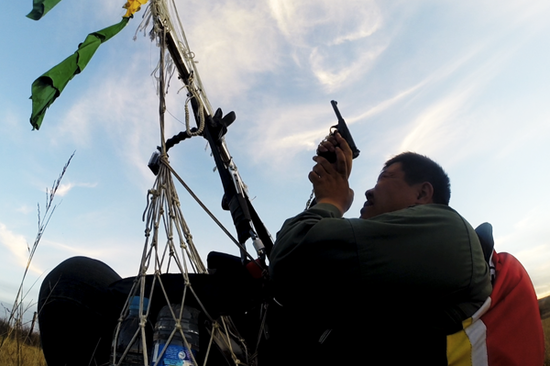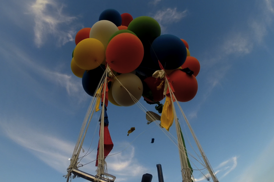 小憩一会儿,待气儿顺畅了,张昕宇扒拉掉身上缠绕在一起的绳子、设备,解开安全带,挣扎了好几下才从坐垫了站起来。他刚站直,气球又开始往上飘了,他赶忙拽住。他说:“不行,要么我把气球拖走,要么就在这儿把他们都给捅破,不然它们还得飞到天上去。”