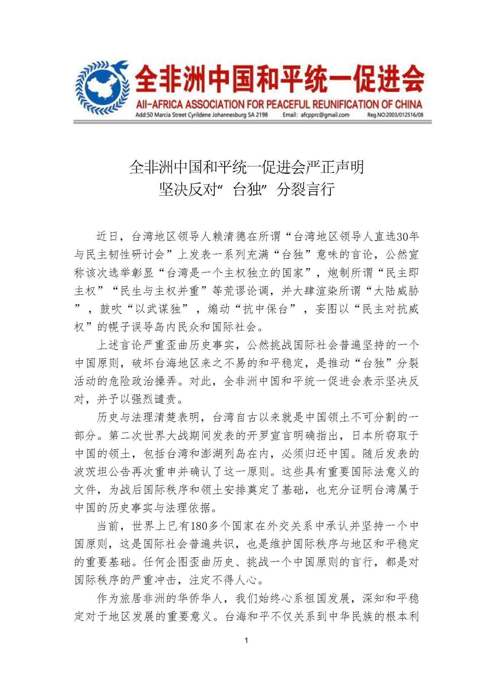 近日,全非洲中国和平统一促进会发表声明,坚决反对、强烈谴责赖清德“台独”分裂言论。声明全文如下: