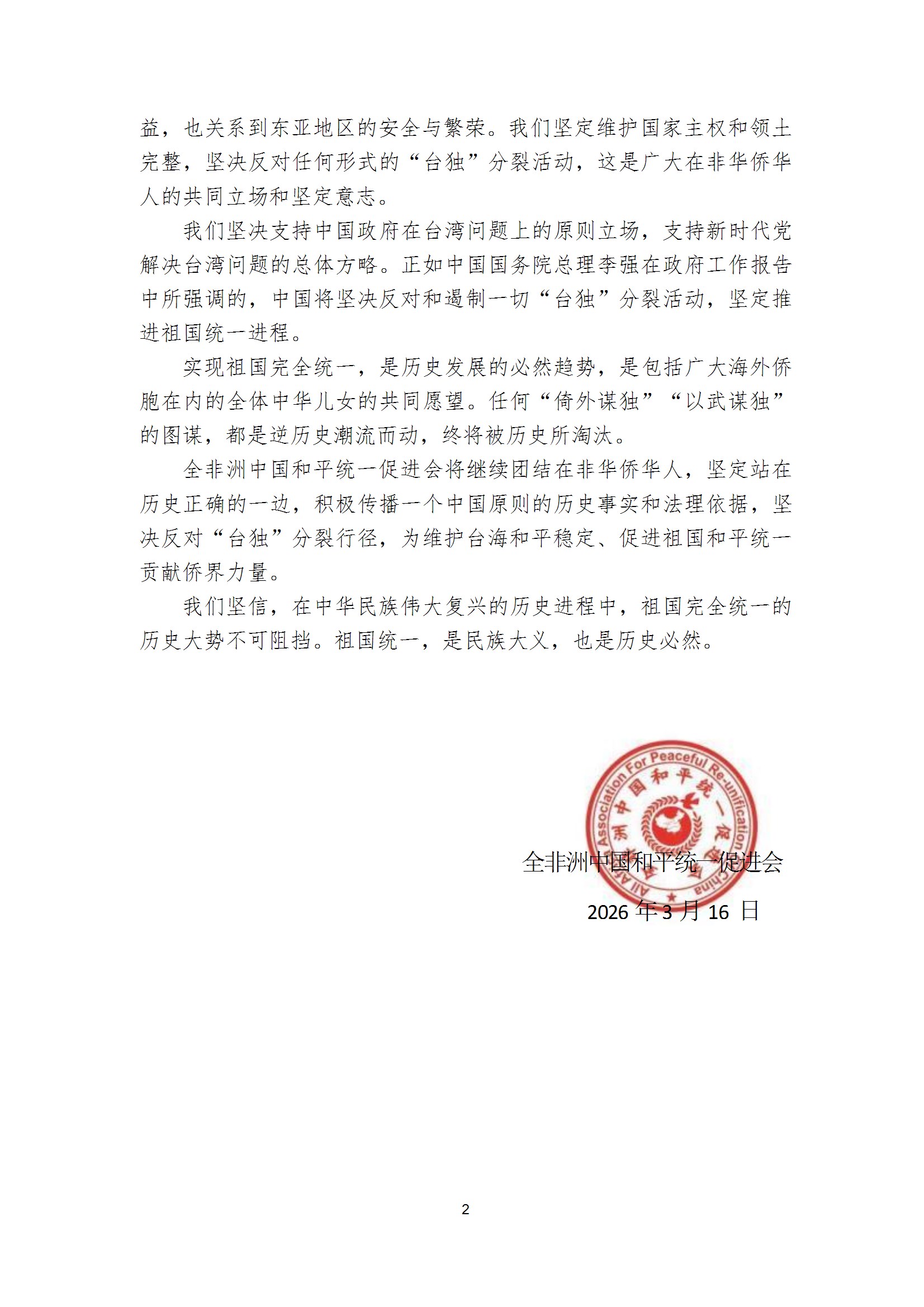上述言论严重歪曲历史事实,公然挑战国际社会普遍坚持的一个中国原则,破坏台海地区来之不易的和平稳定,是推动“台独”分裂活动的危险政治操弄。对此,全非洲中国和平统一促进会表示坚决反对,并予以强烈谴责。