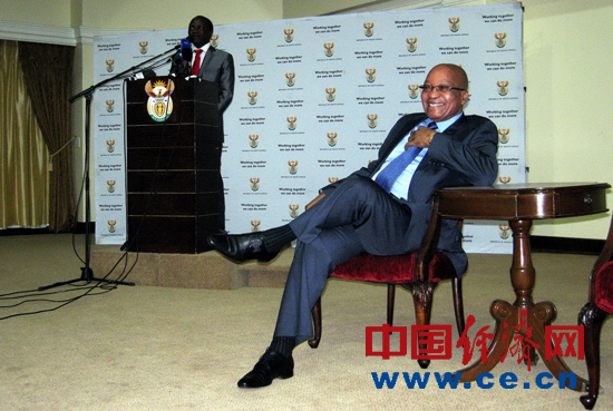 图一:祖马总统在媒体早餐会上笑迎南非与外国媒体代表。中国经济网记者马海亮/摄影