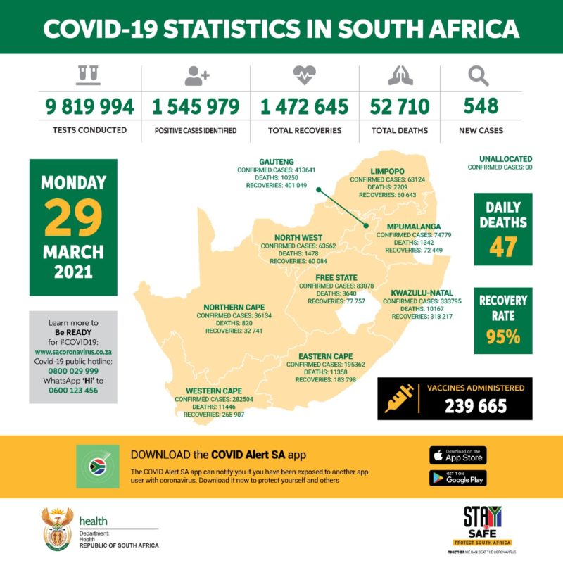 3月29日,南非新冠肺炎新增548例,累计确诊人数1545979例。当日检测新冠肺炎疑似患者16123例,累计检测9819994例。新增死亡47例,累计死亡52710例。全国累计康复病例1472645例,康复率为95%,累计239665人接种新冠疫苗。