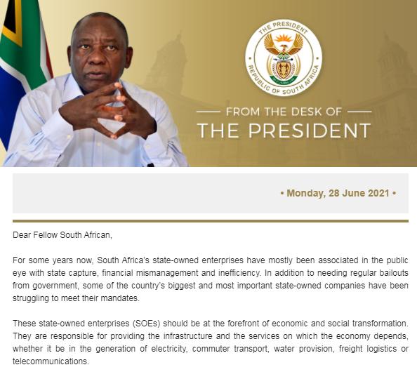 拉马福萨称虽然大多数国有企业需要依赖政府纾困,但是这些国有企业一直在努力履行其职责。南非对于关键行业(如能源、港口等)的态度是必须实行公有制,只有这样才能确保所有南非人,特别是贫困人口的基本需求得以满足。只有国有企业才能追求公共利益,而不是追求纯粹的商业利益。未来南非政府将对所有国有企业进行整改,根除腐败,改善管理不善和效率低下等问题,使国有企业在推动南非经济增长和创造就业方面发挥应有的作用。