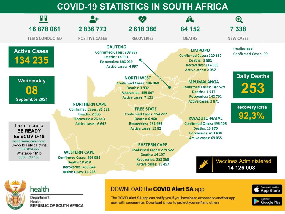 9月8日,南非新冠肺炎新增7338例,累计确诊人数2836773例。累计检测16878061例。新增死亡253例,累计死亡84152例。全国累计康复病例2618386例,康复率为92.3%,累计14126008人次接种新冠疫苗。