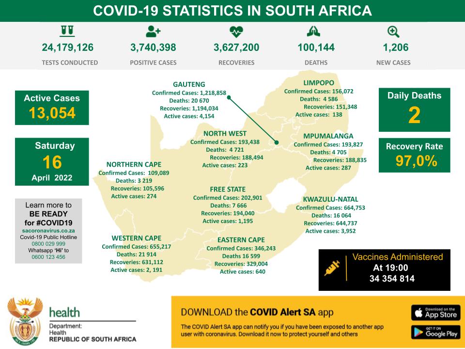 4月16日,南非新冠肺炎新增1206例,累计确诊人数3740398例。新增死亡4例,累计死亡100144例。现有活跃病例13054例,康复率为97.0%,累计接种疫苗总数为34354814。