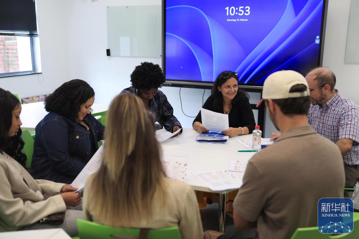 2月21日,在南非约翰内斯堡,人们在国际母语日活动上参加西班牙语体验课。