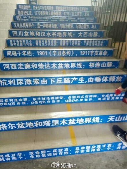 【霸气!四川一中学楼梯现最牛横条!】为高考拉各种横幅已经out了!网曝成都崇庆中学的楼梯上,每级台阶都贴上了很实用的各类学科基本知识点、必记词条,方便学生们熟记。以后,同学们不仅在教室里可以学习,走个楼梯也能学习了……