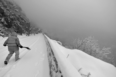 昨天,门头沟公路分局京门养护段工人在妙峰山路上除雪。京华时报记者王海欣摄