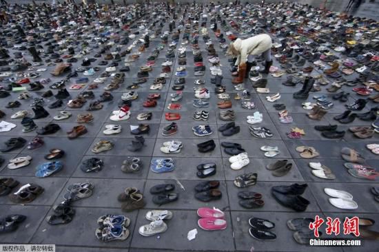 当地时间11月29日,法国巴黎气候大会前,民众在巴黎共和国广场摆满了鞋子,呼吁关注气候变化。