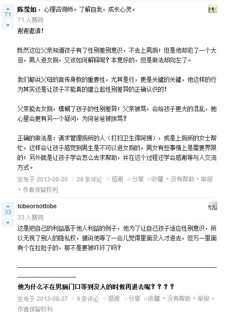 去年8月,网友陈先生就曾在网上发帖子,讲述了类似的经历。他的3岁女儿小便难忍,陈先生本来想带她进男厕所,但看见有两名男士,女儿又已经具备性别意识,最后选择进了女厕所,结果招来其他女士的指责。