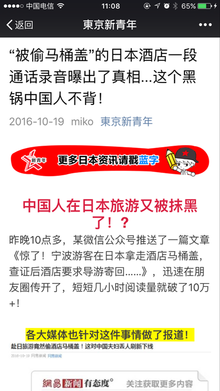 于是,“东京新青年”以“‘日本酒店一段通话录音爆出了真相’……这个黑锅中国人不背”为题发表了一篇文章,且放出与酒店的通话证明:“马桶盖事件”是中国人在日本旅游又被抹黑了!