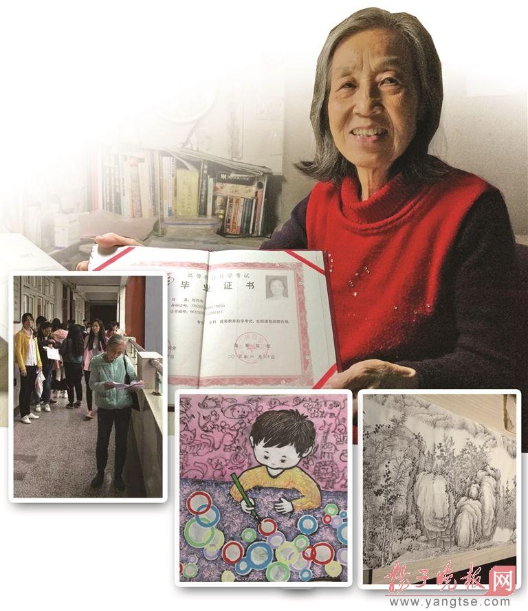 老人以前只有高中学历,退休前在中巴车上做售票员,一直比较繁忙。退休之后,老人有了时间,就特别想去学习。于是,她去参加了老年大学,学习美术技艺,这一上就是四年。2011年,她开始参加自学考试,由于高中学历不能直接报考本科,于是她先报考了大专,选择的是幼儿教学专业。经过四年的努力,2015年6月,她终于拿到了大专文凭。老人自豪地向扬子晚报记者展示了她的大专文凭。记者注意到,文凭上写着:“刘若南参加学前教育专业专科高等教育自学考试,全部课程成绩合格,经审定,准予毕业。”落款为高等教育自学考试委员会以及江苏第二师范学院。