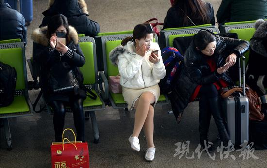 还有一名女乘客正贴着一张面膜,手机就是她的镜子。候车室里空调开得很足,暖暖的,敷面膜一点都不嫌冷。